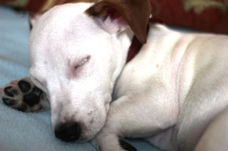 А вообще у нас все хорошо. Питомец растет и превращается в шуструю сардельку. Носится по квартире, не дает спать ночью. Очень любит быть моим тапком - лечь на ступню и заснуть. Вечно голодный, зато на этой почве уже знает "Место", "Сидеть", "Лежать", "Фу". Все еще только начинается. В следующую субботу гулять.